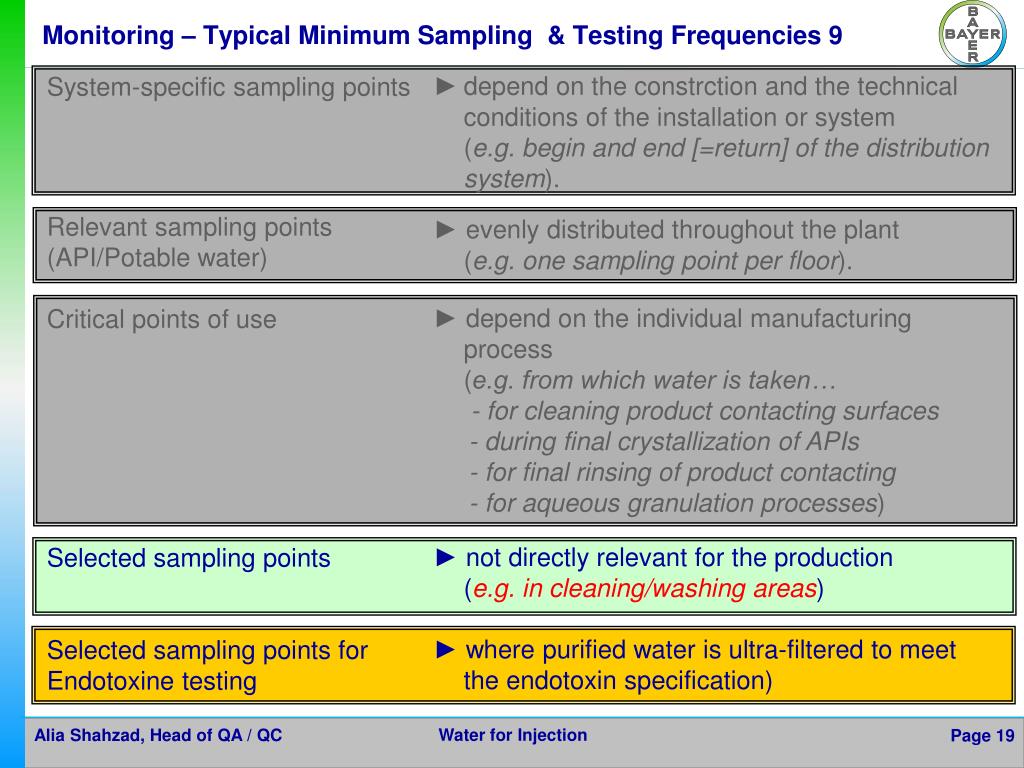 Monitoring – Typical Minimum Sampling & Testing Frequencies 9 ► depend on the constrction and the technical conditions of the installation or system(e.g. begin and end [=return] of the distribution system). ► evenly distributed throughout the plant(e.g. one sampling point per floor). ► depend on the individual manufacturingprocess(e.g. from which water is taken… - for cleaning product contacting surfaces - during final crystallization of APIs - for final rinsing of product contacting - for aqueous granulation processes) ►not directly relevant for the production(e.g. in cleaning/washing areas) ►where purified water is ultra-filtered to meet the endotoxin specification) System-specific sampling points Relevant sampling points (API/Potable water) Critical points of use Selected sampling points Selected sampling points for Endotoxine testing
