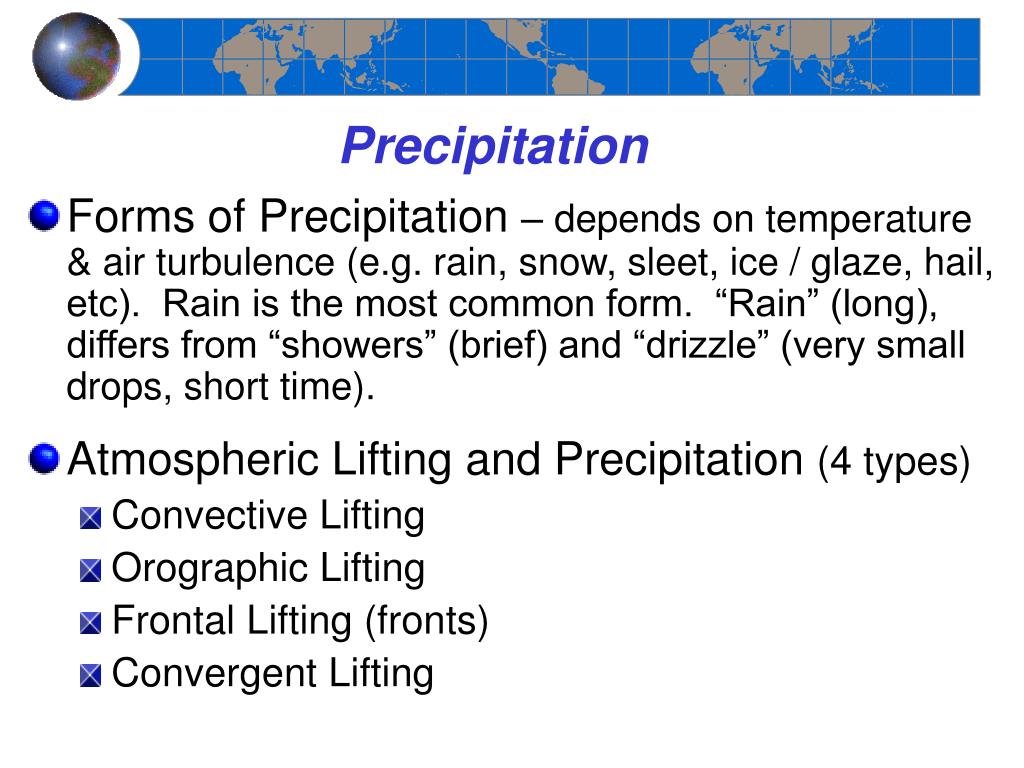 Precipitation • Forms of Precipitation – depends on temperature & air turbulence (e.g. rain, snow, sleet, ice / glaze, hail, etc). Rain is the most common form. “Rain” (long), differs from “showers” (brief) and “drizzle” (very small drops, short time). • Atmospheric Lifting and Precipitation (4 types) • Convective Lifting • Orographic Lifting • Frontal Lifting (fronts) • Convergent Lifting