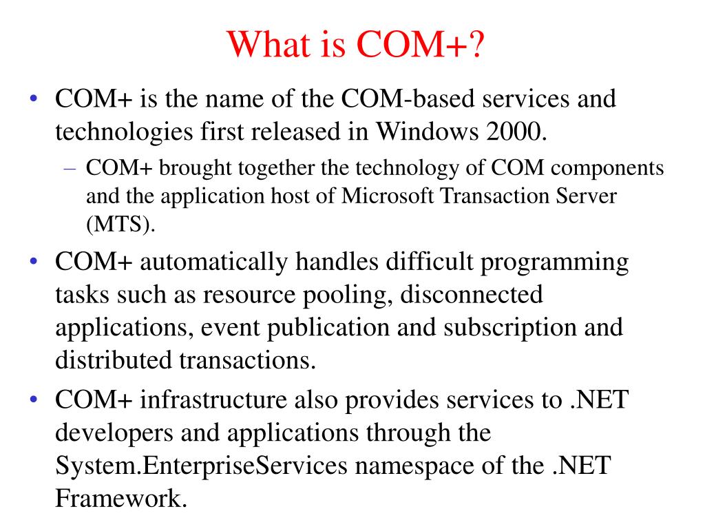 What is COM+? • COM+ is the name of the COM-based services and technologies first released in Windows 2000. • COM+ brought together the technology of COM components and the application host of Microsoft Transaction Server (MTS). • COM+ automatically handles difficult programming tasks such as resource pooling, disconnected applications, event publication and subscription and distributed transactions. • COM+ infrastructure also provides services to .NET developers and applications through the System.EnterpriseServices namespace of the .NET Framework.