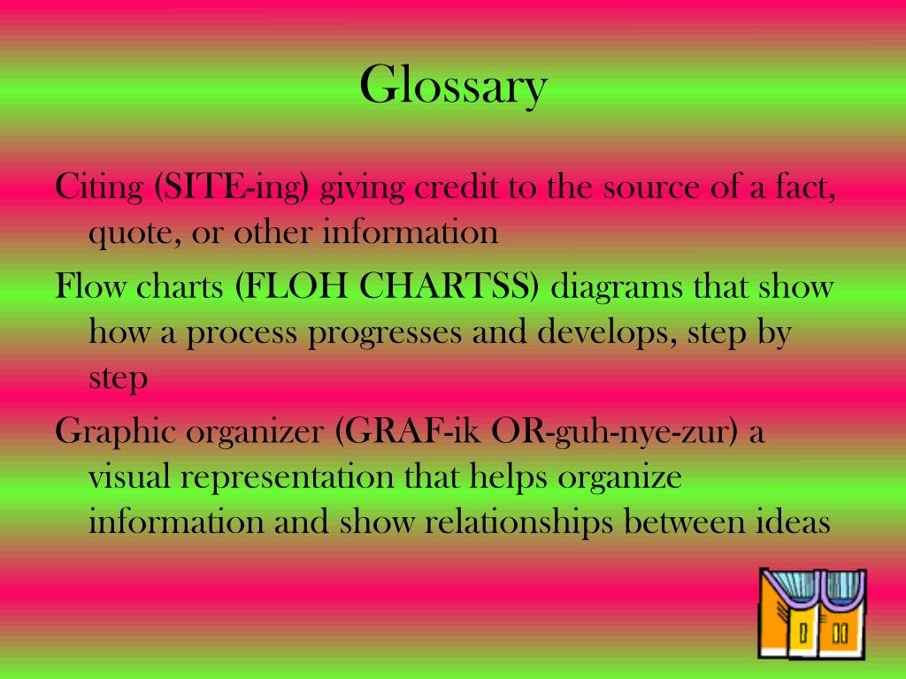 Glossary Citing (SITE-ing) giving credit to the source of a fact, quote, or other information Flow charts (FLOH CHARTSS) diagrams that show how a process progresses and develops, step by step Graphic organizer (GRAF-ik OR-guh-nye-zur)a visual representation that helps organize information and show relationships between ideas