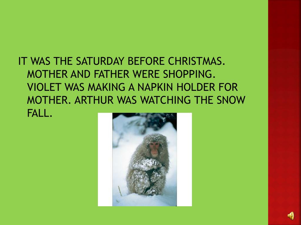 IT WAS THE SATURDAY BEFORE CHRISTMAS. MOTHER AND FATHER WERE SHOPPING. VIOLET WAS MAKING A NAPKIN HOLDER FOR MOTHER. ARTHUR WAS WATCHING THE SNOW FALL.