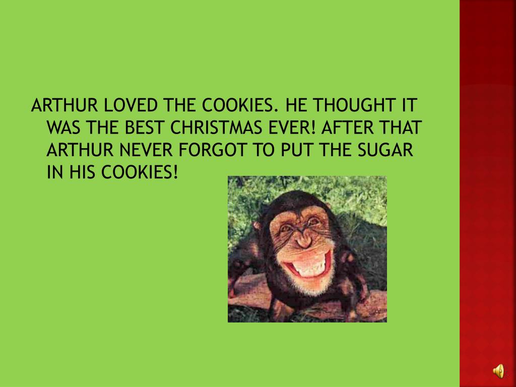 ARTHUR LOVED THE COOKIES. HE THOUGHT IT WAS THE BEST CHRISTMAS EVER! AFTER THAT ARTHUR NEVER FORGOT TO PUT THE SUGAR IN HIS COOKIES!