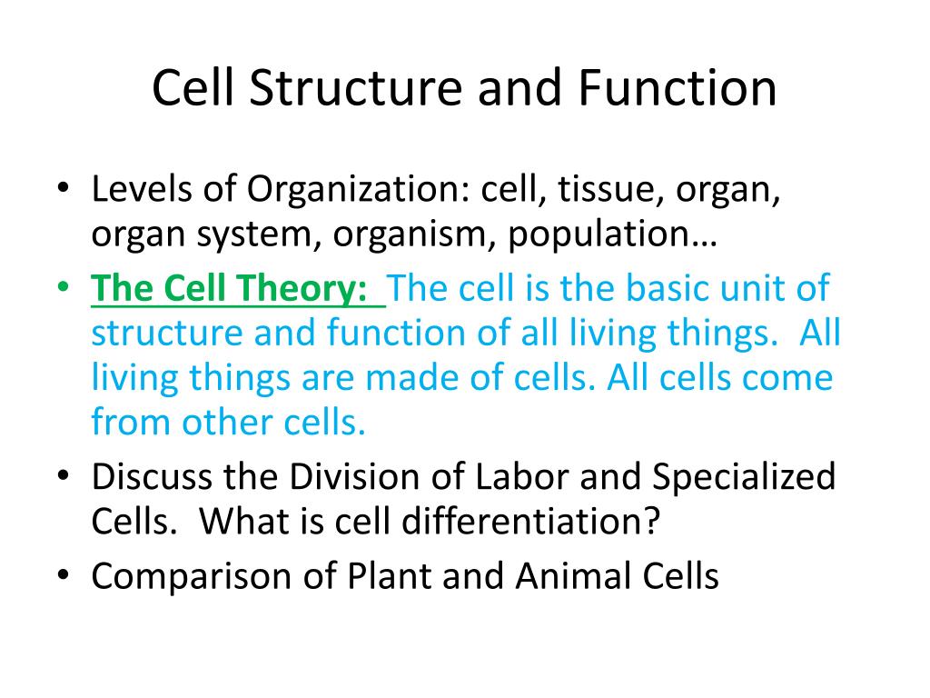 Cell Structure and Function • Levels of Organization: cell, tissue, organ, organ system, organism, population… • The Cell Theory: The cell is the basic unit of structure and function of all living things. All living things are made of cells. All cells come from other cells. • Discuss the Division of Labor and Specialized Cells. What is cell differentiation? • Comparison of Plant and Animal Cells