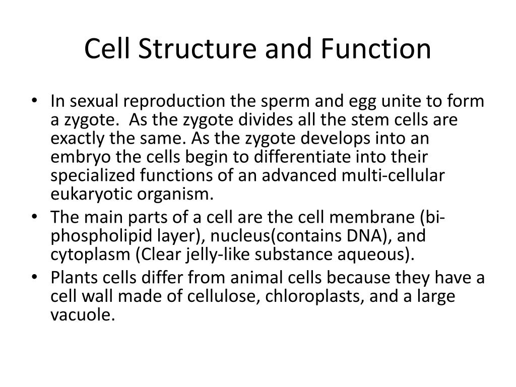 Cell Structure and Function • In sexual reproduction the sperm and egg unite to form a zygote. As the zygote divides all the stem cells are exactly the same. As the zygote develops into an embryo the cells begin to differentiate into their specialized functions of an advanced multi-cellular eukaryotic organism. • The main parts of a cell are the cell membrane (bi-phospholipid layer), nucleus(contains DNA), and cytoplasm (Clear jelly-like substance aqueous). • Plants cells differ from animal cells because they have a cell wall made of cellulose, chloroplasts, and a large vacuole.