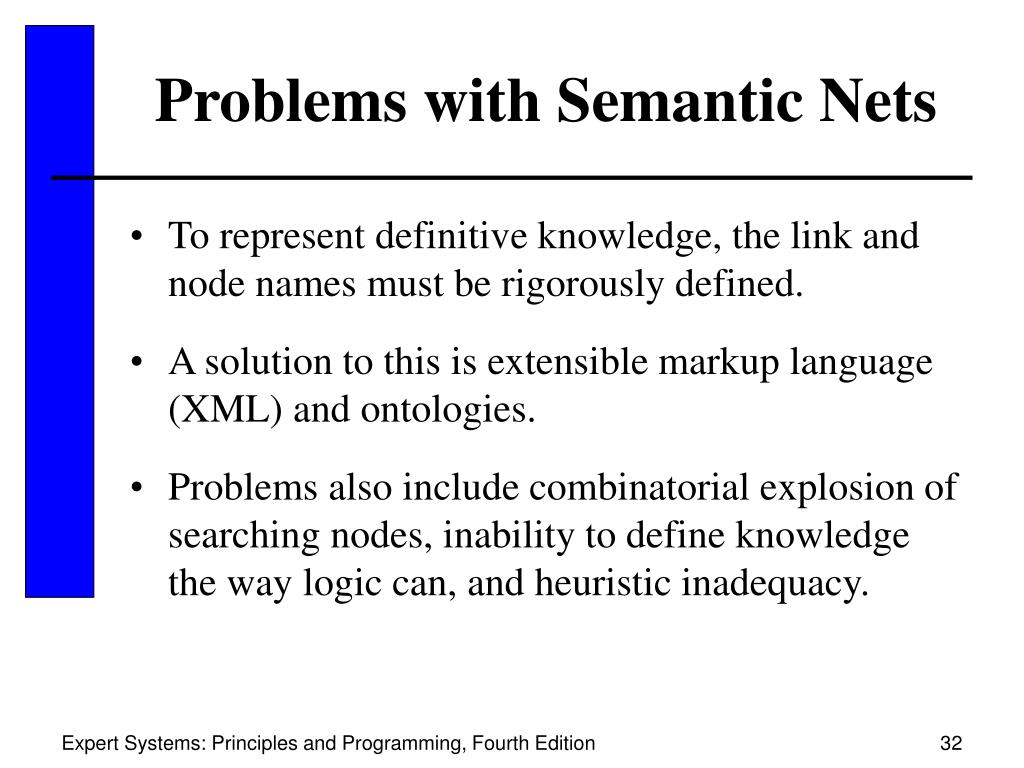 Problems with Semantic Nets • To represent definitive knowledge, the link and node names must be rigorously defined. • A solution to this is extensible markup language (XML) and ontologies. • Problems also include combinatorial explosion of searching nodes, inability to define knowledge the way logic can, and heuristic inadequacy. Expert Systems: Principles and Programming, Fourth Edition
