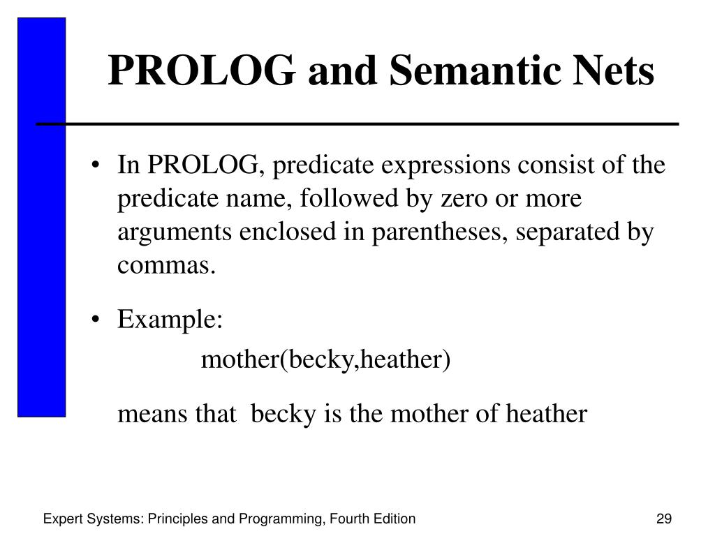 PROLOG and Semantic Nets • In PROLOG, predicate expressions consist of the predicate name, followed by zero or more arguments enclosed in parentheses, separated by commas. • Example: mother(becky,heather) means that becky is the mother of heather Expert Systems: Principles and Programming, Fourth Edition