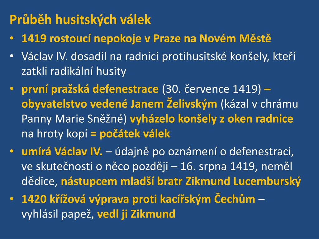 Průběh husitských válek • 1419 rostoucí nepokoje v Praze na Novém Městě • Václav IV. dosadil na radnici protihusitské konšely, kteří zatkli radikální husity • první pražská defenestrace (30. července 1419) – obyvatelstvo vedené Janem Želivským (kázal v chrámu Panny Marie Sněžné) vyházelo konšely z oken radnice na hroty kopí = počátek válek • umírá Václav IV. – údajně po oznámení o defenestraci, ve skutečnosti o něco později – 16. srpna 1419, neměl dědice, nástupcem mladší bratr Zikmund Lucemburský • 1420 křížová výprava proti kacířským Čechům – vyhlásil papež, vedl ji Zikmund