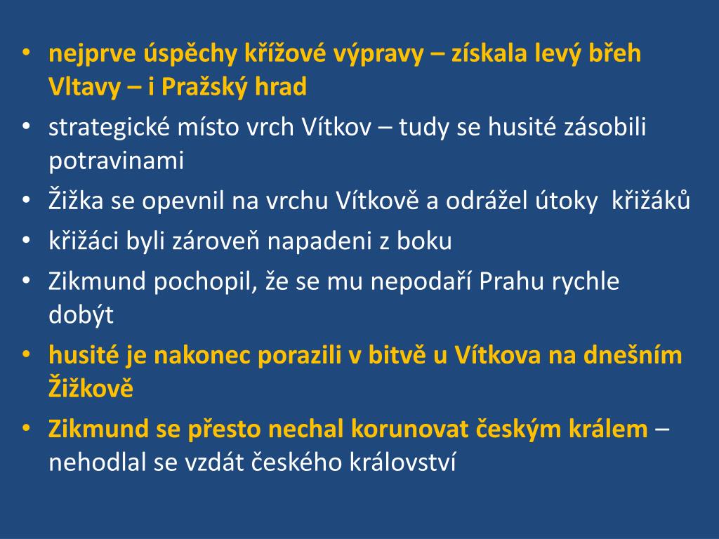 nejprve úspěchy křížové výpravy – získala levý břeh Vltavy – i Pražský hrad • strategické místo vrch Vítkov – tudy se husité zásobili potravinami • Žižka se opevnil na vrchu Vítkově a odrážel útoky křižáků • křižáci byli zároveň napadeni z boku • Zikmund pochopil, že se mu nepodaří Prahu rychle dobýt • husité je nakonec porazili v bitvě u Vítkova na dnešním Žižkově • Zikmund se přesto nechal korunovat českým králem – nehodlal se vzdát českého království