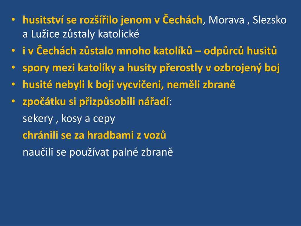 husitství se rozšířilo jenom v Čechách, Morava , Slezsko a Lužice zůstaly katolické • i v Čechách zůstalo mnoho katolíků – odpůrců husitů • spory mezi katolíky a husity přerostly v ozbrojený boj • husité nebyli k boji vycvičeni, neměli zbraně • zpočátku si přizpůsobili nářadí: sekery , kosy a cepy chránili se za hradbami z vozů naučili se používat palné zbraně