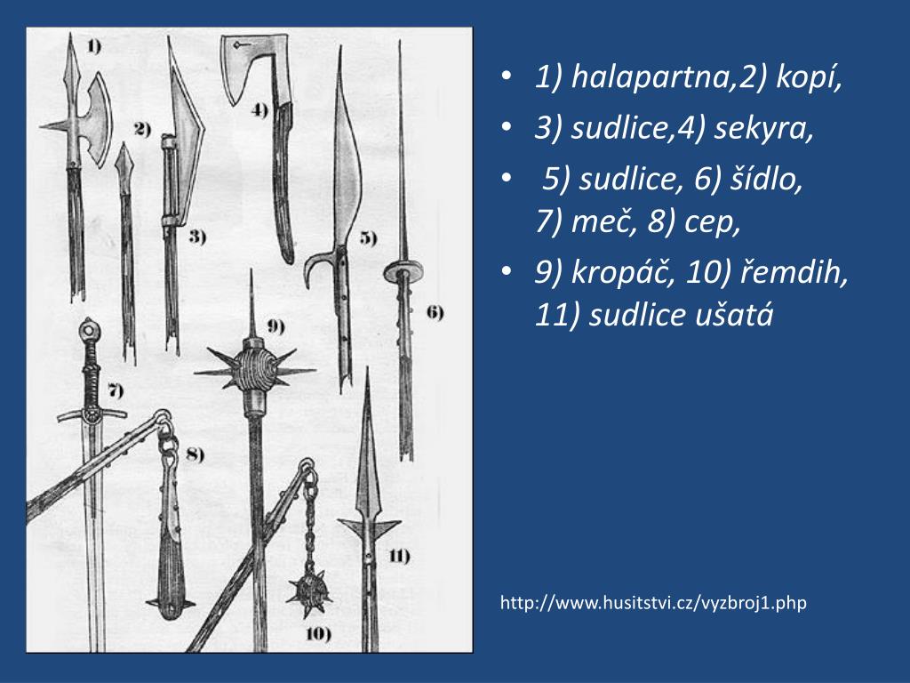 http://www.husitstvi.cz/vyzbroj1.php 1) halapartna,2) kopí, 3) sudlice,4) sekyra, 5) sudlice, 6) šídlo,7) meč, 8) cep, 9) kropáč, 10) řemdih, 11) sudlice ušatá