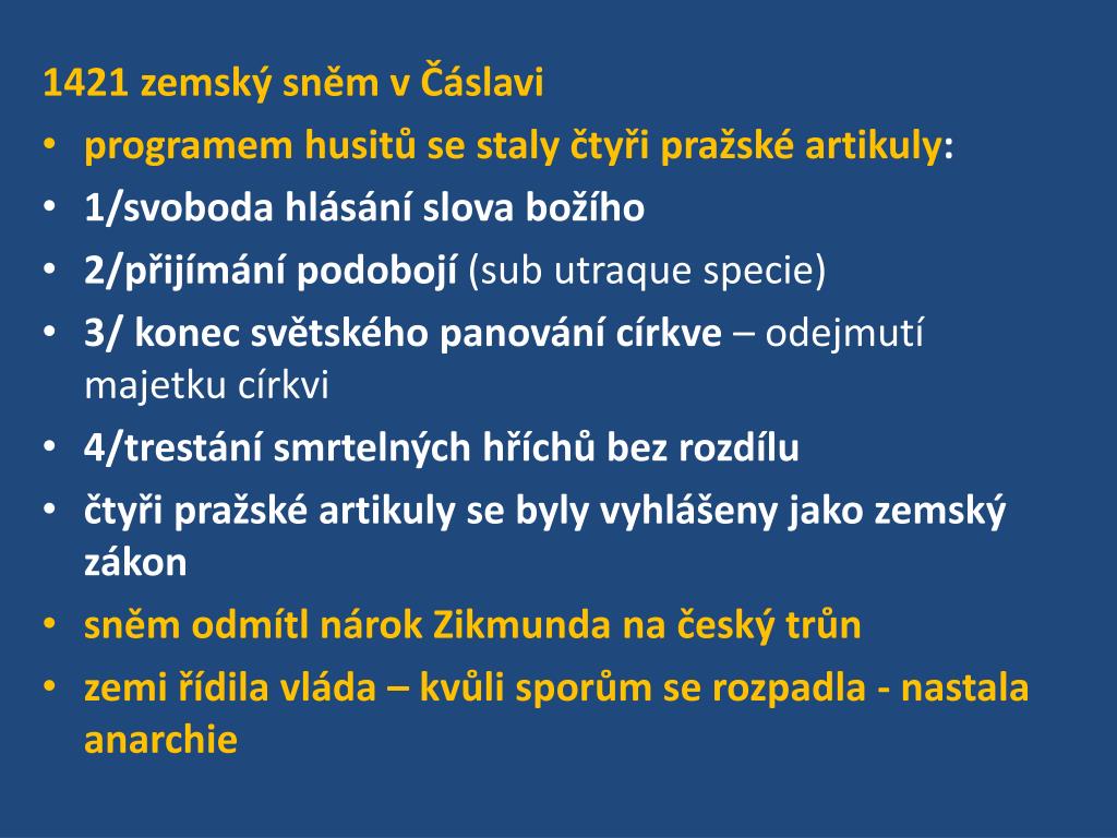 1421 zemský sněm v Čáslavi • programem husitů se staly čtyři pražské artikuly: • 1/svoboda hlásání slova božího • 2/přijímání podobojí (sub utraque specie) • 3/ konec světského panování církve – odejmutí majetku církvi • 4/trestání smrtelných hříchů bez rozdílu • čtyři pražské artikuly se byly vyhlášeny jako zemský zákon • sněm odmítl nárok Zikmunda na český trůn • zemi řídila vláda – kvůli sporům se rozpadla - nastala anarchie