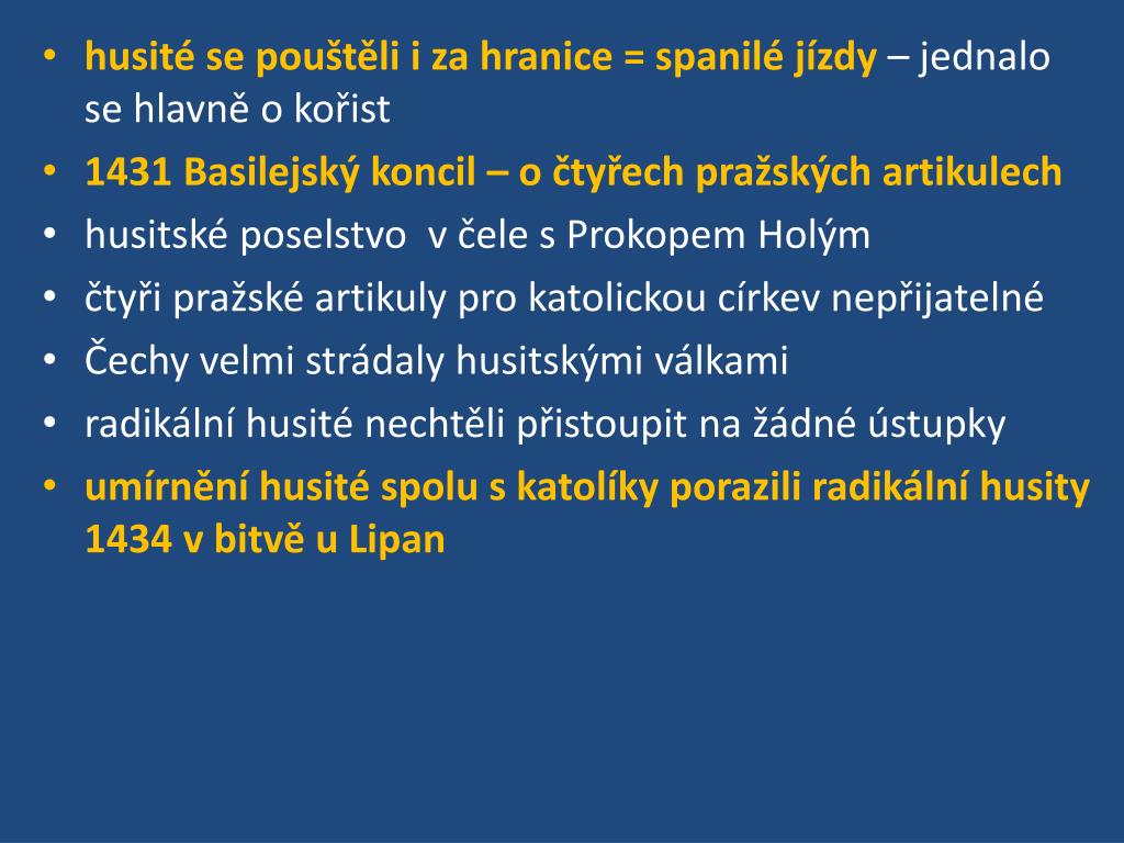 husité se pouštěli i za hranice = spanilé jízdy – jednalo se hlavně o kořist • 1431 Basilejský koncil – o čtyřech pražských artikulech • husitské poselstvo v čele s Prokopem Holým • čtyři pražské artikuly pro katolickou církev nepřijatelné • Čechy velmi strádaly husitskými válkami • radikální husité nechtěli přistoupit na žádné ústupky • umírnění husité spolu s katolíky porazili radikální husity 1434 v bitvě u Lipan