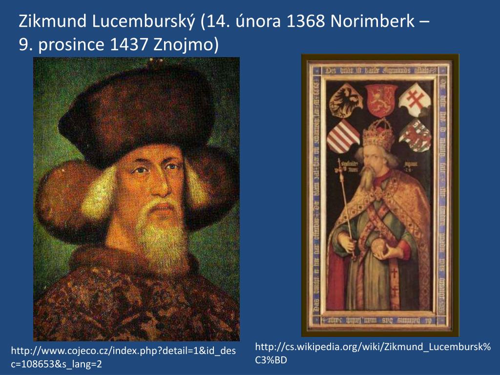 Zikmund Lucemburský (14. února 1368 Norimberk – 9. prosince 1437 Znojmo) http://cs.wikipedia.org/wiki/Zikmund_Lucembursk%C3%BD http://www.cojeco.cz/index.php?detail=1&id_desc=108653&s_lang=2