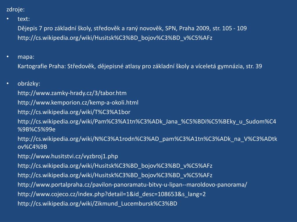 zdroje: • text: Dějepis 7 pro základní školy, středověk a raný novověk, SPN, Praha 2009, str. 105 - 109 http://cs.wikipedia.org/wiki/Husitsk%C3%BD_bojov%C3%BD_v%C5%AFz • mapa: Kartografie Praha: Středověk, dějepisné atlasy pro základní školy a víceletá gymnázia, str. 39 • obrázky: http://www.zamky-hrady.cz/3/tabor.htm http://www.kemporion.cz/kemp-a-okoli.html http://cs.wikipedia.org/wiki/T%C3%A1bor http://cs.wikipedia.org/wiki/Pam%C3%A1tn%C3%ADk_Jana_%C5%BDi%C5%BEky_u_Sudom%C4%9B%C5%99e http://cs.wikipedia.org/wiki/N%C3%A1rodn%C3%AD_pam%C3%A1tn%C3%ADk_na_V%C3%ADtkov%C4%9B http://www.husitstvi.cz/vyzbroj1.php http://cs.wikipedia.org/wiki/Husitsk%C3%BD_bojov%C3%BD_v%C5%AFz http://cs.wikipedia.org/wiki/Husitsk%C3%BD_bojov%C3%BD_v%C5%AFz http://www.portalpraha.cz/pavilon-panoramatu-bitvy-u-lipan--maroldovo-panorama/ http://www.cojeco.cz/index.php?detail=1&id_desc=108653&s_lang=2 http://cs.wikipedia.org/wiki/Zikmund_Lucembursk%C3%BD