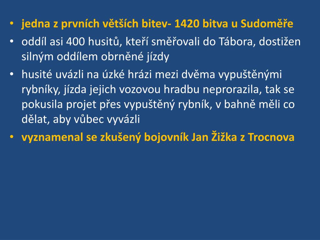 jedna z prvních větších bitev- 1420 bitva u Sudoměře oddíl asi 400 husitů, kteří směřovali do Tábora, dostižen silným oddílem obrněné jízdy husité uvázli na úzké hrázi mezi dvěma vypuštěnými rybníky, jízda jejich vozovou hradbu neprorazila, tak se pokusila projet přes vypuštěný rybník, v bahně měli co dělat, aby vůbec vyvázli vyznamenal se zkušený bojovník Jan Žižka z Trocnova