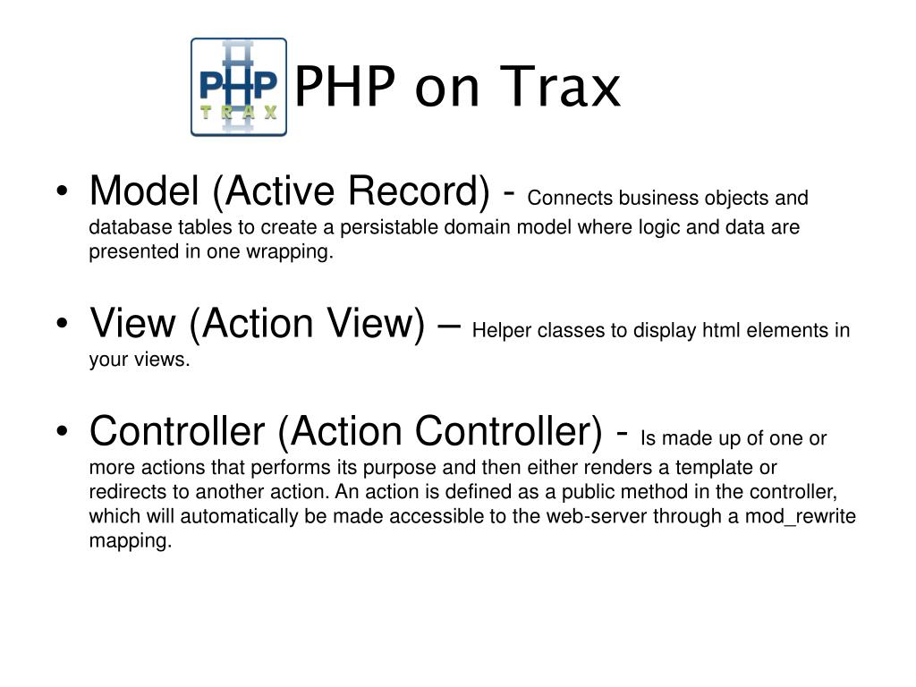 PHP on Trax • Model (Active Record) - Connects business objects and database tables to create a persistable domain model where logic and data are presented in one wrapping. • View (Action View) – Helper classes to display html elements in your views. • Controller (Action Controller) - Is made up of one or more actions that performs its purpose and then either renders a template or redirects to another action. An action is defined as a public method in the controller, which will automatically be made accessible to the web-server through a mod_rewrite mapping.