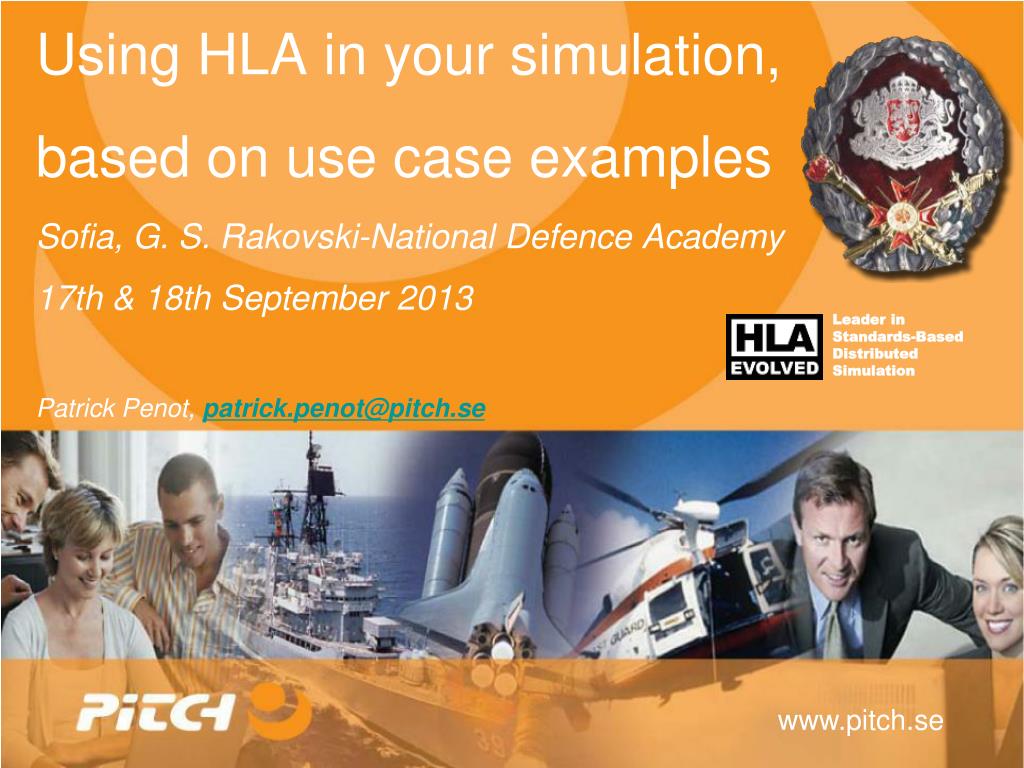 Using HLA in your simulation,based on use case examplesSofia, G. S. Rakovski-National Defence Academy17th & 18th September 2013 Patrick Penot, patrick.penot@pitch.se Leader in Standards-Based Distributed Simulation