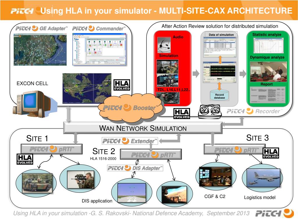 Using HLA in your simulator - MULTI-SITE-CAX ARCHITECTURE After Action Review solution for distributed simulation Statistic analyze Data of simulation Audio Simulation Dynamiqueanalyze EXCON CELL Wan Network Simulation Site 3 Site 1 Site 2 Report HLA 1516-2000 TDL, L16,L11,L22.. Record database CGF & C2 Logisticsmodel DIS application