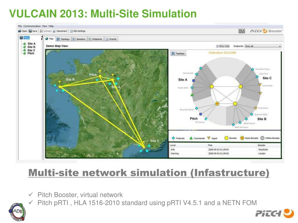 VULCAIN 2013: Multi-Site Simulation • Multi-site network simulation (Infastructure) • Pitch Booster, virtual network • Pitch pRTI , HLA 1516-2010 standard usingpRTI V4.5.1 and a NETN FOM