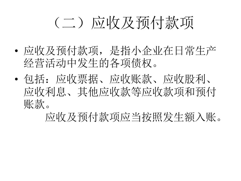 (二)应收及预付款项 • 应收及预付款项,是指小企业在日常生产经营活动中发生的各项债权。 • 包括:应收票据、应收账款、应收股利、应收利息、其他应收款等应收款项和预付账款。 应收及预付款项应当按照发生额入账。