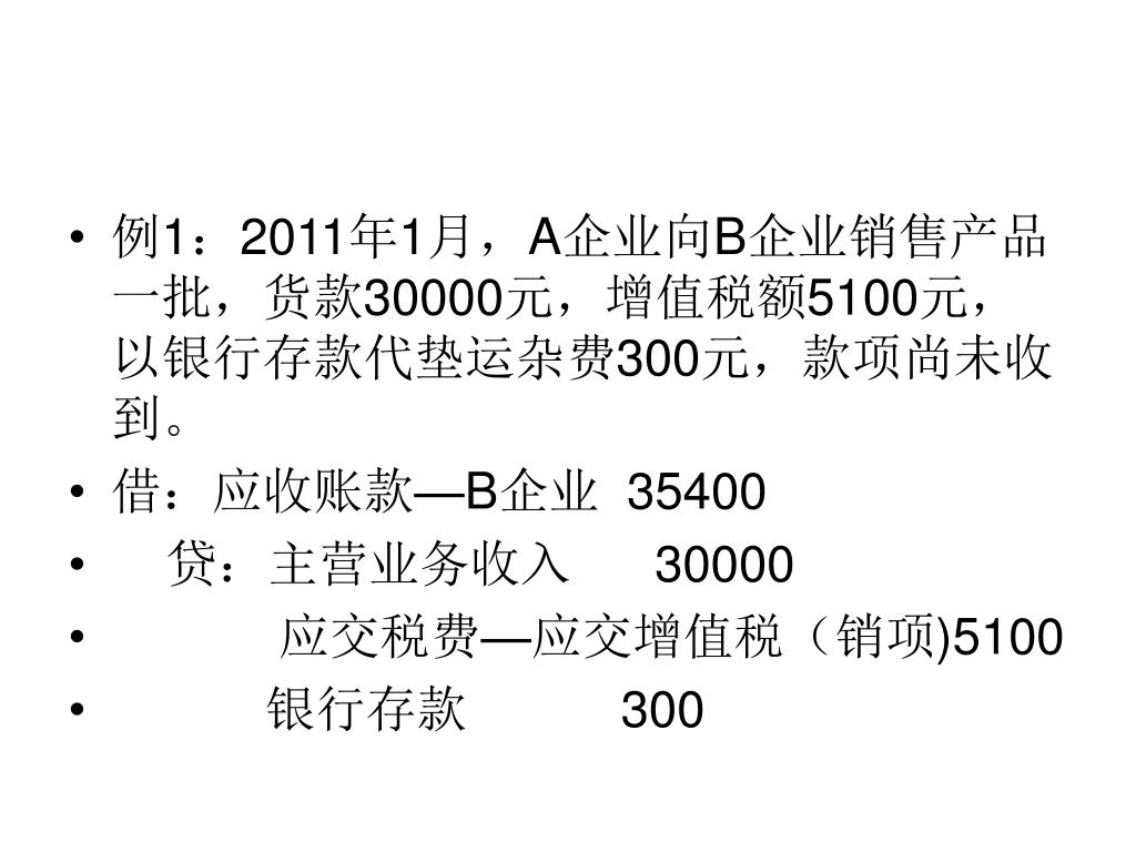 例1:2011年1月,A企业向B企业销售产品一批,货款30000元,增值税额5100元,以银行存款代垫运杂费300元,款项尚未收到。例1:2011年1月,A企业向B企业销售产品一批,货款30000元,增值税额5100元,以银行存款代垫运杂费300元,款项尚未收到。 • 借:应收账款—B企业 35400 • 贷:主营业务收入 30000 • 应交税费—应交增值税(销项)5100 • 银行存款 300