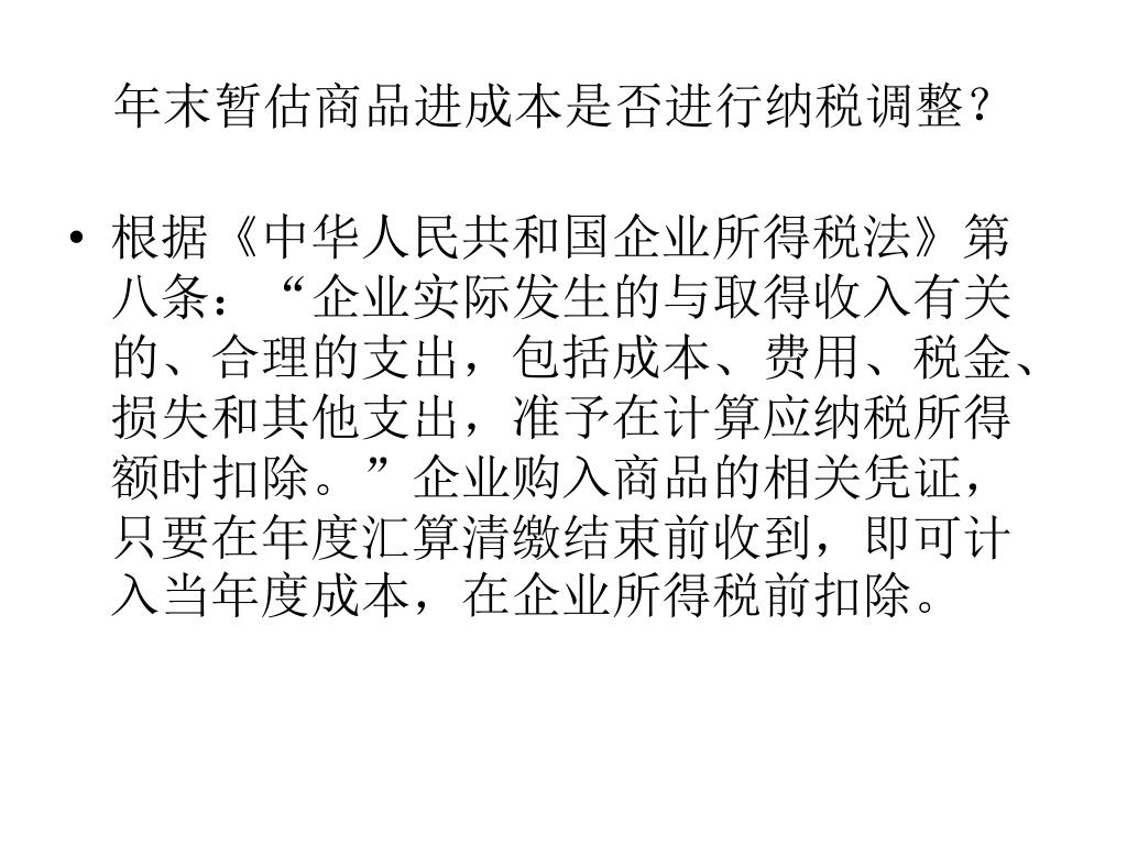 年末暂估商品进成本是否进行纳税调整? • 根据《中华人民共和国企业所得税法》第八条:“企业实际发生的与取得收入有关的、合理的支出,包括成本、费用、税金、损失和其他支出,准予在计算应纳税所得额时扣除。”企业购入商品的相关凭证,只要在年度汇算清缴结束前收到,即可计入当年度成本,在企业所得税前扣除。