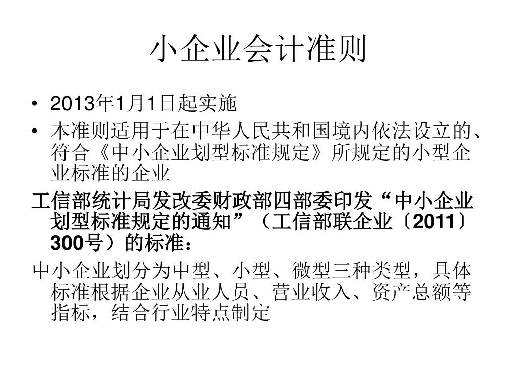 小企业会计准则 • 2013年1月1日起实施 • 本准则适用于在中华人民共和国境内依法设立的、符合《中小企业划型标准规定》所规定的小型企业标准的企业 工信部统计局发改委财政部四部委印发“中小企业划型标准规定的通知”(工信部联企业〔2011〕300号)的标准: 中小企业划分为中型、小型、微型三种类型,具体标准根据企业从业人员、营业收入、资产总额等指标,结合行业特点制定