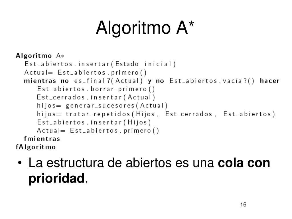 Tratamiento de repetidos • Si es un repetido que está en la estructura de abiertos: • Si su nuevo coste (g) es menor substituimos el coste por el nuevo; esto podrá variar su posición en la estructura de abiertos. • Si su nuevo coste (g) es igual o mayor nos olvidamos del nodo. • Si es un repetido que está en la estructura de cerrados: • Si su nuevo coste (g) es menor reabrimos el nodo insertándolo en la estructura de abiertos con el nuevo coste. • ¡Atención! No hacemos nada con sus sucesores; ya se reabrirán si hace falta. • Si su nuevo coste (g) es mayor o igual nos olvidamos del nodo.
