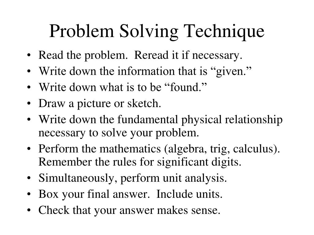 Problem Solving Technique • Read the problem. Reread it if necessary. • Write down the information that is “given.” • Write down what is to be “found.” • Draw a picture or sketch. • Write down the fundamental physical relationship necessary to solve your problem. • Perform the mathematics (algebra, trig, calculus). Remember the rules for significant digits. • Simultaneously, perform unit analysis. • Box your final answer. Include units. • Check that your answer makes sense.