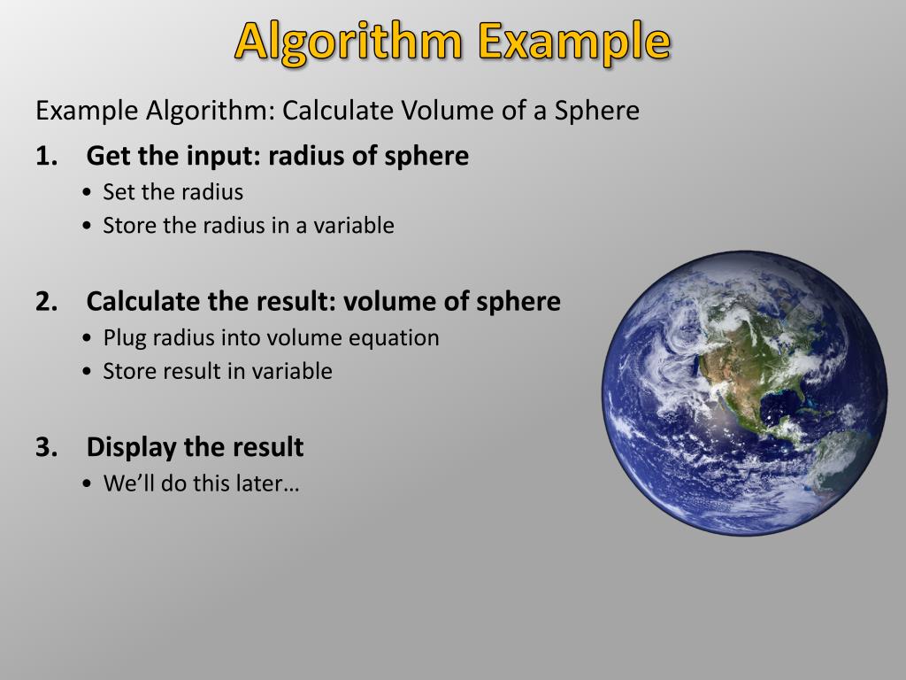 Algorithm Example Example Algorithm: Calculate Volume of a Sphere • Get the input: radius of sphere • Set the radius • Store the radius in a variable • Calculate the result: volume of sphere • Plug radius into volume equation • Store result in variable • Display the result • We’ll do this later…