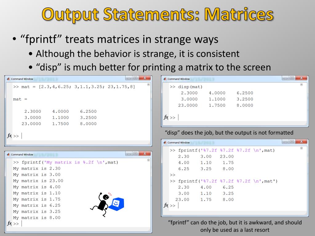 Output Statements: Matrices • “fprintf” treats matrices in strange ways • Although the behavior is strange, it is consistent • “disp” is much better for printing a matrix to the screen “disp” does the job, but the output is not formatted “fprintf” can do the job, but it is awkward, and should only be used as a last resort