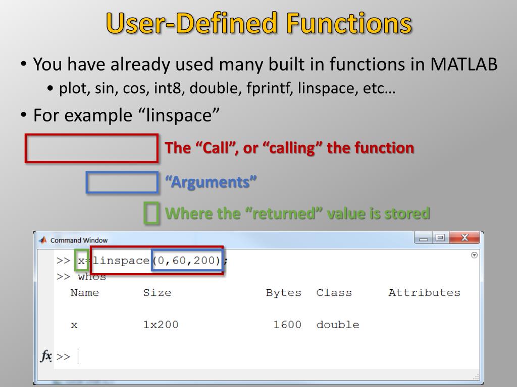 User-Defined Functions • You have already used many built in functions in MATLAB • plot, sin, cos, int8, double, fprintf, linspace, etc… • For example “linspace” The “Call”, or “calling” the function “Arguments” Where the “returned” value is stored