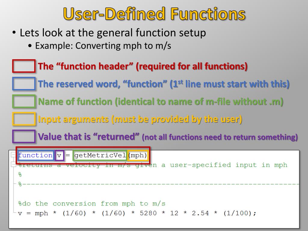User-Defined Functions • Lets look at the general function setup • Example: Converting mph to m/s The “function header” (required for all functions) The reserved word, “function” (1st line must start with this) Name of function (identical to name of m-file without .m) Input arguments (must be provided by the user) Value that is “returned” (not all functions need to return something)
