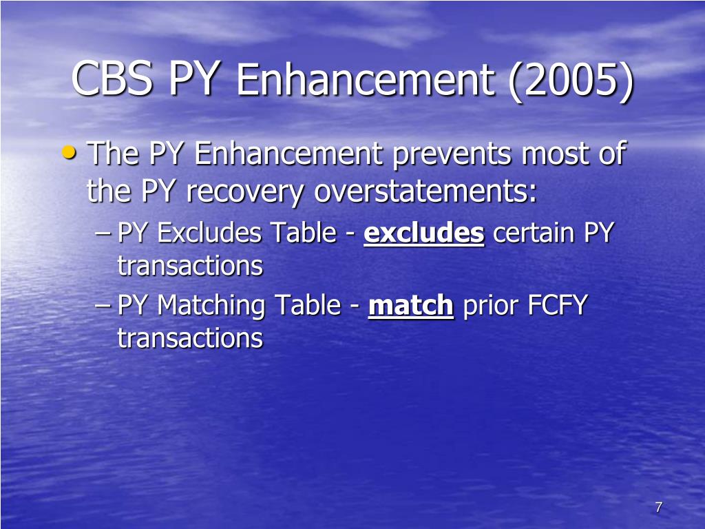 CBS PY Enhancement (2005) • The PY Enhancement prevents most of the PY recovery overstatements: • PY Excludes Table - excludes certain PY transactions • PY Matching Table - match prior FCFY transactions