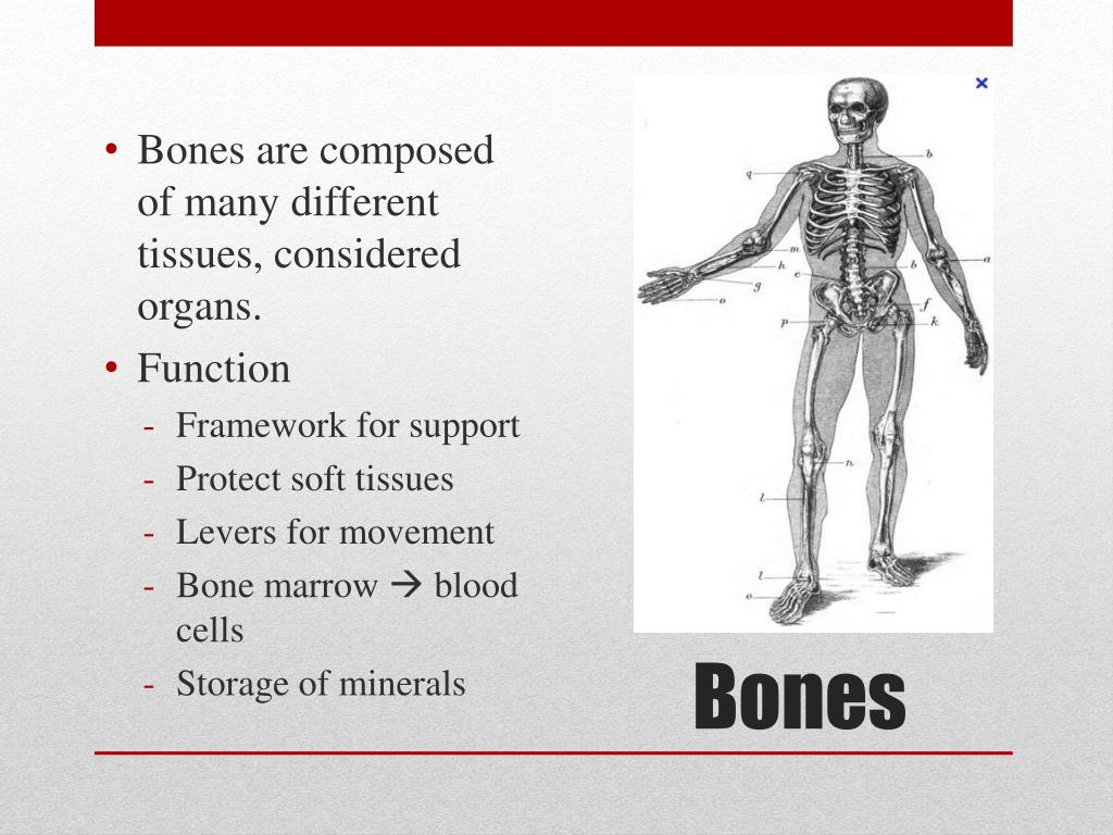 Bones are composed of many different tissues, considered organs. • Function • Framework for support • Protect soft tissues • Levers for movement • Bone marrow blood cells • Storage of minerals Bones
