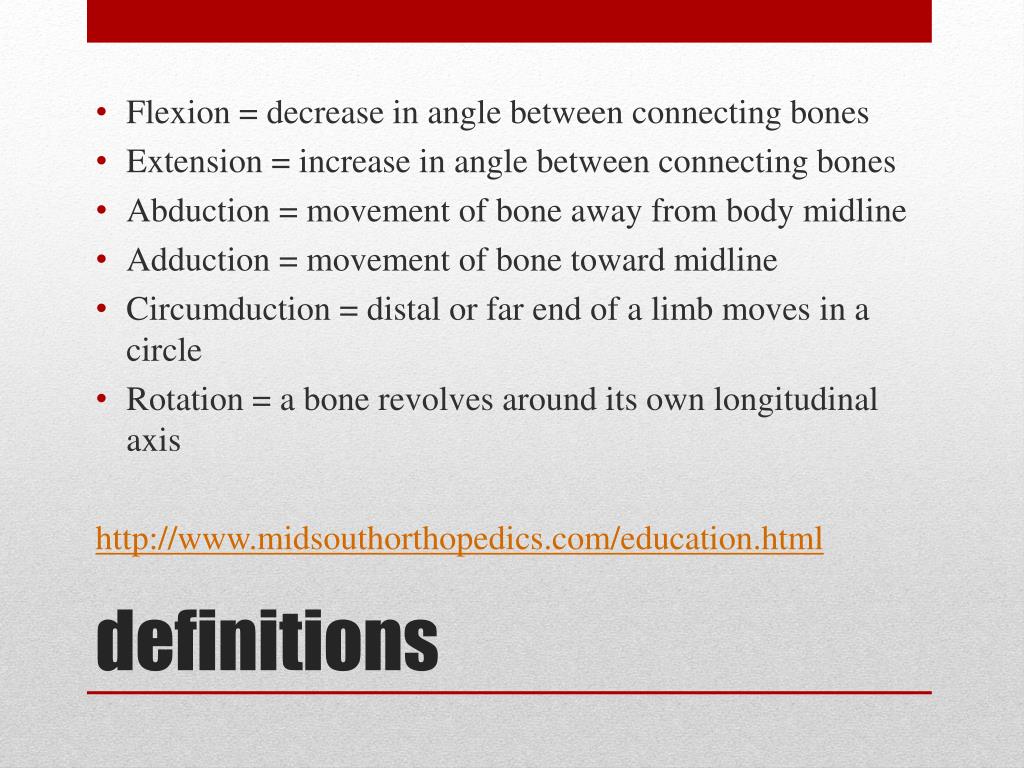 Flexion = decrease in angle between connecting bones • Extension = increase in angle between connecting bones • Abduction = movement of bone away from body midline • Adduction = movement of bone toward midline • Circumduction = distal or far end of a limb moves in a circle • Rotation = a bone revolves around its own longitudinal axis http://www.midsouthorthopedics.com/education.html definitions