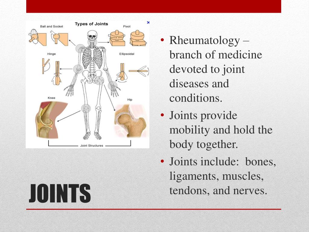 Rheumatology – branch of medicine devoted to joint diseases and conditions. • Joints provide mobility and hold the body together. • Joints include: bones, ligaments, muscles, tendons, and nerves. JOINTS