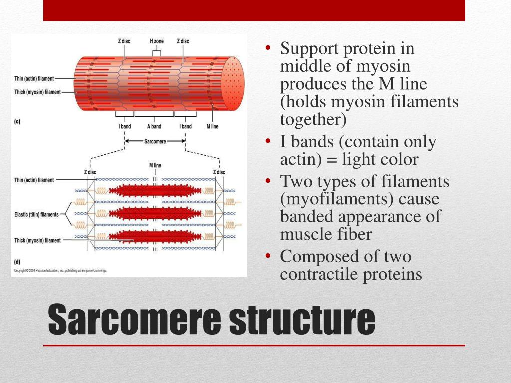 Support protein in middle of myosin produces the M line (holds myosin filaments together) • I bands (contain only actin) = light color • Two types of filaments (myofilaments) cause banded appearance of muscle fiber • Composed of two contractile proteins Sarcomere structure