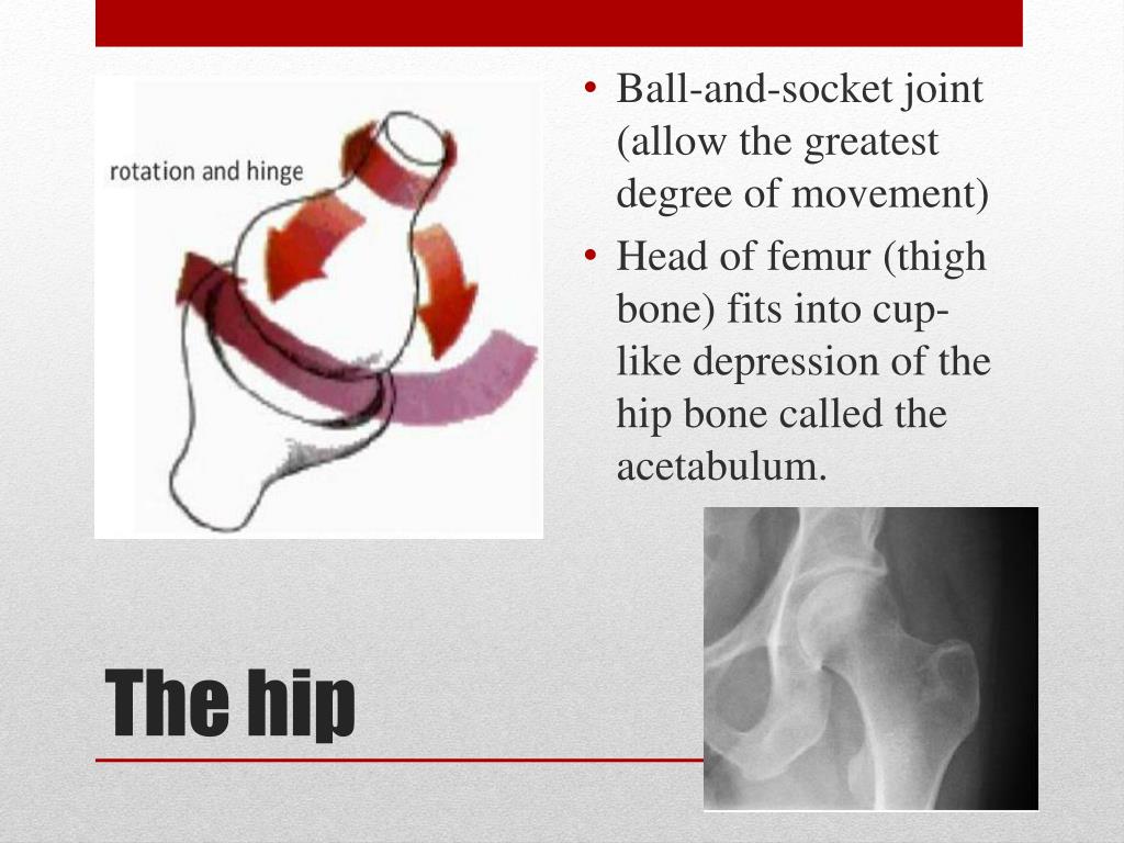 Ball-and-socket joint (allow the greatest degree of movement) • Head of femur (thigh bone) fits into cup-like depression of the hip bone called the acetabulum. The hip