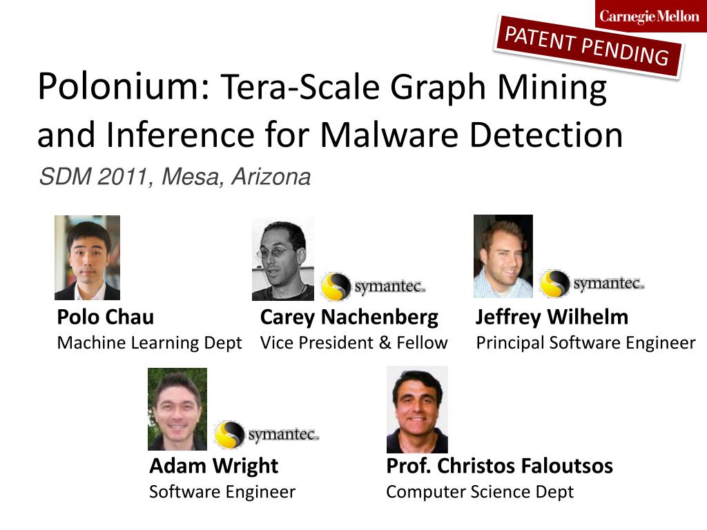 PATENT PENDING SDM 2011, Mesa, Arizona Polonium: Tera-Scale Graph Mining and Inference for Malware Detection Polo Chau Machine Learning Dept Carey Nachenberg Vice President & Fellow Jeffrey Wilhelm Principal Software Engineer Adam Wright Software Engineer Prof. Christos Faloutsos Computer Science Dept