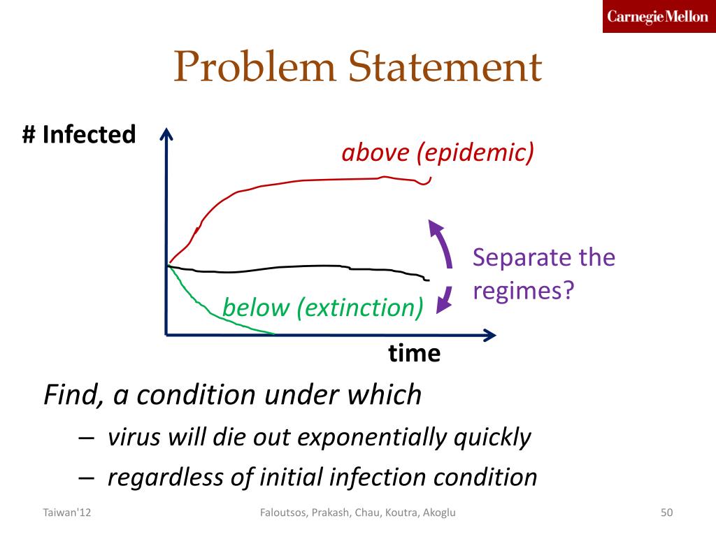 Problem Statement # Infected above (epidemic) below (extinction) time Separate the regimes? Find, a condition under which • virus will die out exponentially quickly • regardless of initial infection condition Faloutsos, Prakash, Chau, Koutra, Akoglu