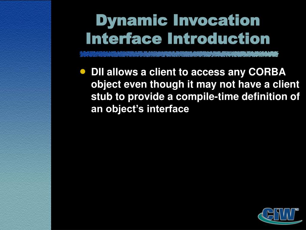 Dynamic InvocationInterface Introduction • DII allows a client to access any CORBA object even though it may not have a client stub to provide a compile-time definition of an object’s interface