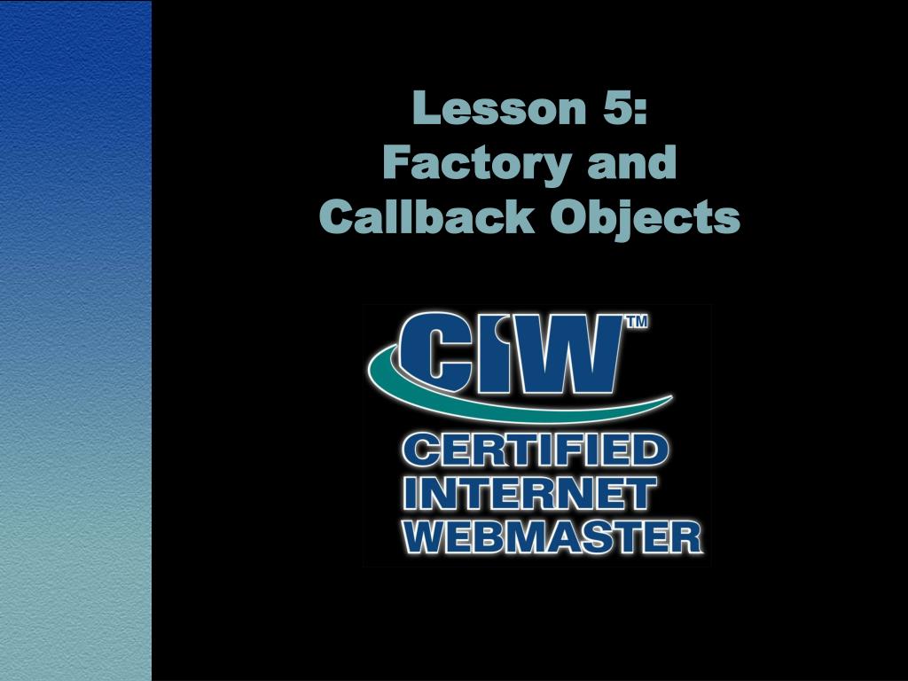Objectives • Describe the purpose of factory objects • Use factory objects to obtain object references • Describe the purpose of callback objects • Develop applications that use callback objects