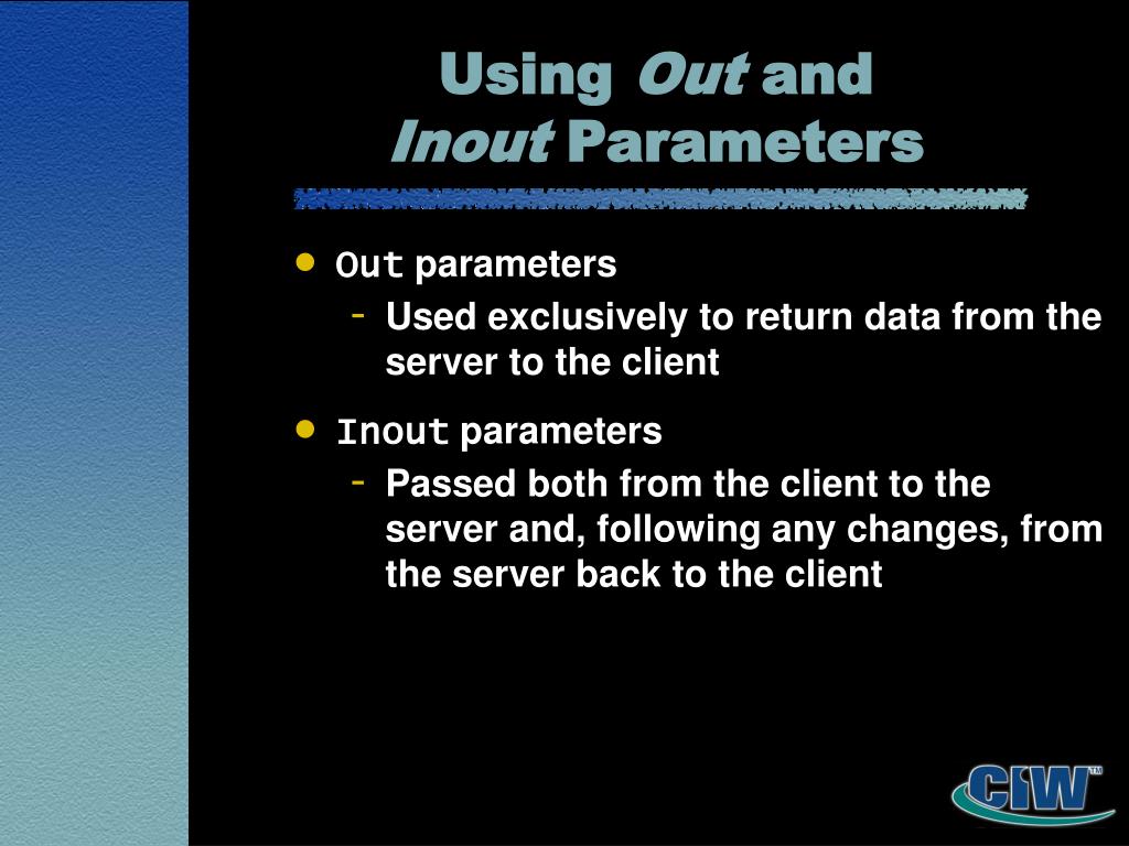 Using Out andInout Parameters • Out parameters • Used exclusively to return data from the server to the client • Inout parameters • Passed both from the client to the server and, following any changes, from the server back to the client