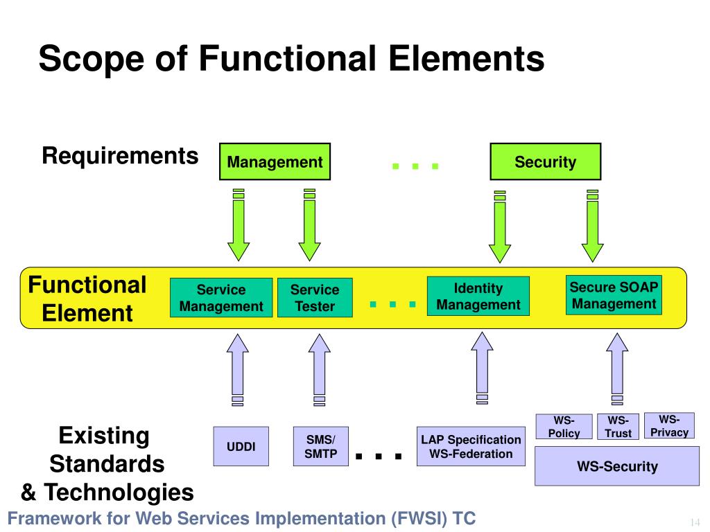 What is a Functional Element? • A Functional Element is a • building block representing common re-usable functionalities • for web service-enabled implementations • without re-inventing them for each implementation • expected to be implemented as re-usable components with web services capabilities where appropriate