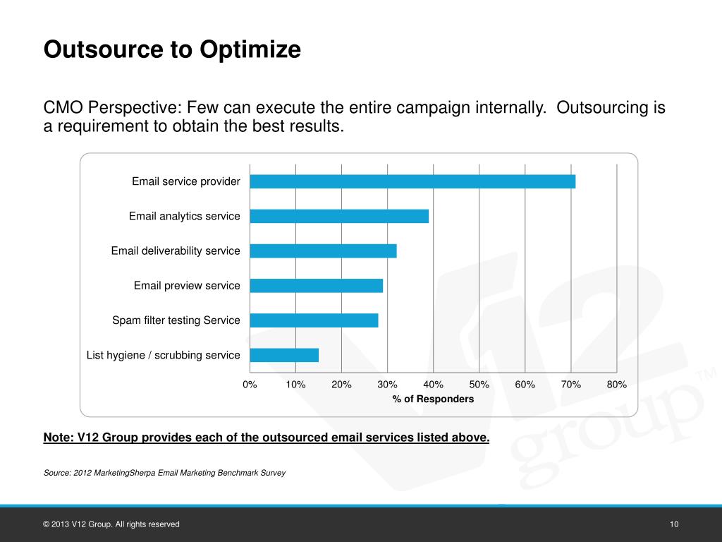 Outsource to Optimize CMO Perspective: Few can execute the entire campaign internally. Outsourcing is a requirement to obtain the best results. Note: V12 Group provides each of the outsourced email services listed above. Source: 2012 MarketingSherpa Email Marketing Benchmark Survey