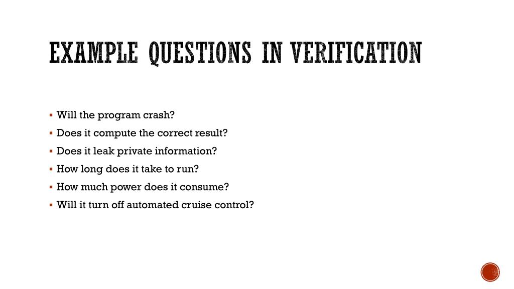 Example Questions in Verification • Will the program crash? • Does it compute the correct result? • Does it leak private information? • How long does it take to run? • How much power does it consume? • Will it turn off automated cruise control?