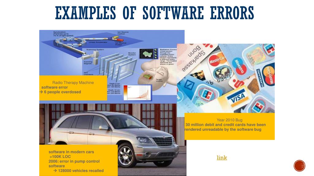 Examples of Software Errors Radio Therapy Machine software error 6 people overdosed Year 2010 Bug 30 million debit and credit cards have been rendered unreadable by the software bug software in modern cars >100K LOC 2006: error in pump control software 128000 vehicles recalled link