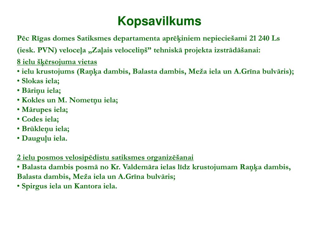 Kopsavilkums Pēc Rīgas domes Satiksmes departamenta aprēķiniem nepieciešami 21 240 Ls (iesk. PVN) veloceļa „Zaļais veloceliņš” tehniskā projekta izstrādāšanai: 8 ielu šķērsojuma vietas • ielu krustojums (Raņķa dambis, Balasta dambis, Meža iela un A.Grīna bulvāris); • Slokas iela; • Bāriņu iela; • Kokles un M. Nometņu iela; • Mārupes iela; • Codes iela; • Brūkleņu iela; • Dauguļu iela. 2 ielu posmos velosipēdistu satiksmes organizēšanai • Balasta dambis posmā no Kr. Valdemāra ielas līdz krustojumam Raņķa dambis, Balasta dambis, Meža iela un A.Grīna bulvāris; • Spirgus iela un Kantora iela.