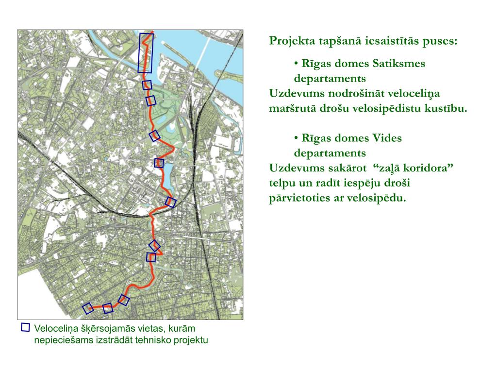Projekta tapšanā iesaistītās puses: • Rīgas domes Satiksmes departaments Uzdevums nodrošināt veloceliņa maršrutā drošu velosipēdistu kustību. • Rīgas domes Vides departaments Uzdevums sakārot “zaļā koridora” telpu un radīt iespēju droši pārvietoties ar velosipēdu. Veloceliņa šķērsojamās vietas, kurām nepieciešams izstrādāt tehnisko projektu